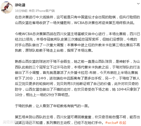 今晚WCBA总决赛第四战在四川女篮主场富顺文体中心进行,本场比赛前,四川已经2比1领先,本场夺冠就将队史第三次捧起总冠军奖杯,但她们没想到,今晚的对手山西队做出了一次重大调整:本赛季中途上任的外教米卡在第三场比赛后不再执教,原球队助教于琦走上台前,指挥了本场比赛。