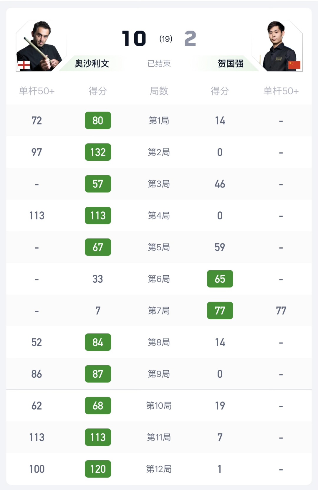 中盘阶段,贺国强在巨大劣势下顶住压力,第7局轰出个人全场最高的单杆77分,连扳两局,把比分追至2-5,短暂止住颓势。关键时刻,奥沙利文第8局再度打出单杆50+强势回应,随即连赢数局,将比分带到7-2,重新稳住局面。