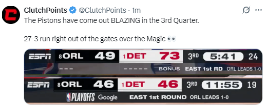 虽然魔术队在本节末尾情况略有好转,但活塞队一度在比赛中打出30-3的高潮,还是在社交媒体上引发了热议。