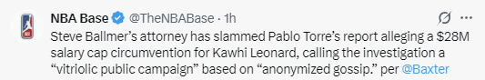 2026-04-23 09:40北京时间4月23日,根据ESPN记者Baxter Holmes报道,鲍尔默的代理律师表示快船老板被Aspiration联合创始人约瑟夫-桑伯格诈骗,还指出播客主持人巴勃罗-托雷关于莱昂纳德与快船搞阴阳合同规避工资帽的爆料是一场“针对鲍尔默先生的恶意公开攻击”,且“主要基于匿名小道消息”。