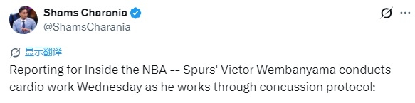 今日名记shams在节目组透露文班的最新情况,他表示:我被告知,当地时间周三晚些时候,文班亚马在圣城参加了有氧训练,因为他的症状没有加重。他的身体状况并没有比G2那次脑震荡刚发生时更糟…… 他希望自己能随队前往波特兰,但他能否及时通过脑震荡保护协议、赶上周六在波特兰的G3显然还是个未知数,对马刺来说也存在明显的出战隐患。
