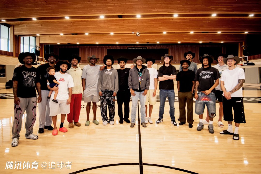 今日凯尔登-约翰逊夺得年度最佳第六人,马刺全队戴着牛仔帽祝贺凯尔登,全队合影留念,文班亚马也在镜头中,满脸笑容十分开心。