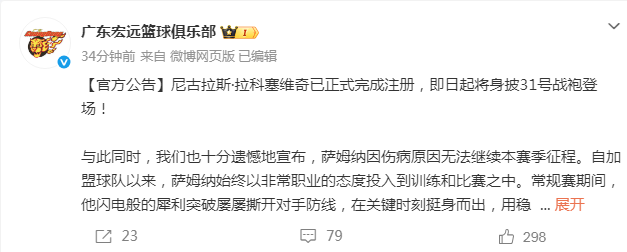2026-04-24 10:20北京时间4月24日,广东男篮官方发布公告,上赛季CBA得分王、本赛季队内得分王小外援萨姆纳因为伤病原因,无法继续剩余比赛赛季报销。广东男篮已经给新外援拉科塞维奇完成正式注册,他将身穿31号球衣征战。