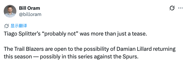 不过据美记Bill Oram报道,斯普利特那句“大概率不会”,可不只是随口调侃。开拓者方面正考虑利拉德本赛季回归的可能性,甚至可能就在对阵马刺的这轮系列赛中复出。
