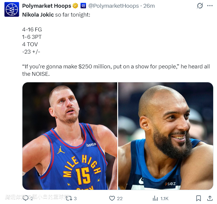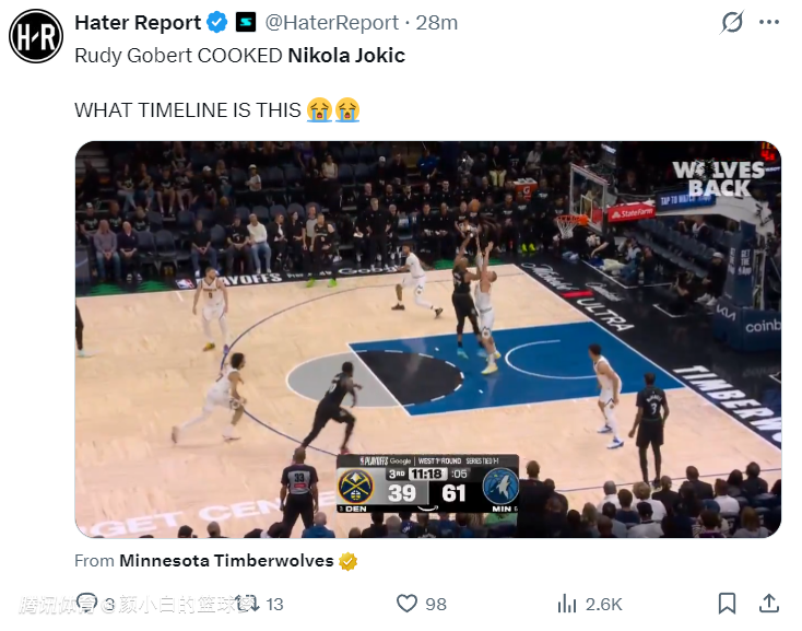 2026-04-24 12:10北京时间4月24日,丹佛掘金惨败明尼苏达森林狼,大比分1-2落后。这场比赛尼古拉-约基奇又被鲁迪-戈贝尔给防出心理阴影了,他不管是在篮下、中距离、外线都打不了戈贝尔,被戈贝尔两次大帽拒绝更是丢脸无比,木狼能反超掘金戈贝尔绝对是第一功臣,约基奇联盟一哥的席位要被他打没了。
