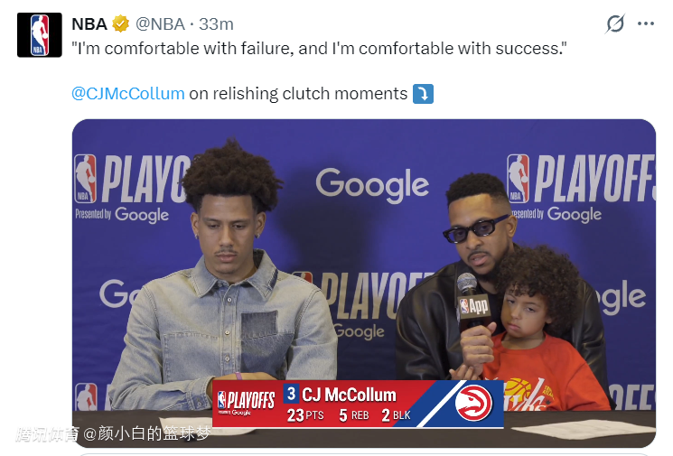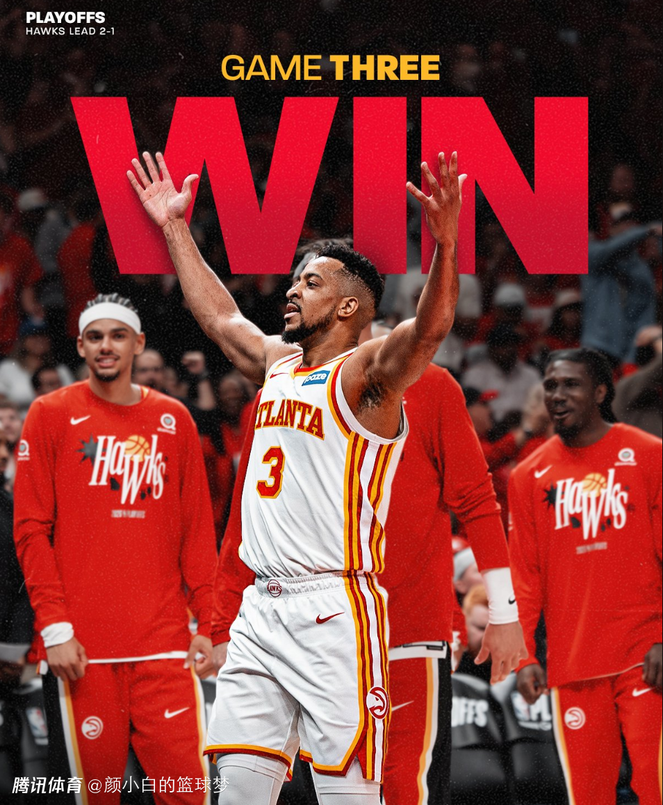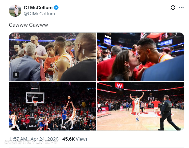 2026-04-24 14:00北京时间4月24日,NBA季后赛G3,老鹰再一次完成以下克上,109-108险胜尼克斯,大比分2-1,目前东区第六与西部第六都已经大比分2-1领先同分区的三号种子。CJ-麦科勒姆这位34岁的老将登上了赢球海报。