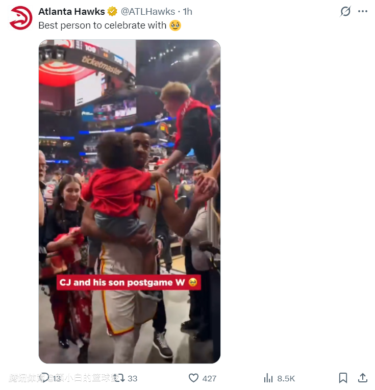 老鹰官方转发了CJ抱着儿子与球迷们互动的瞬间写道:值得一生一起度过的人。(眼泪汪汪)