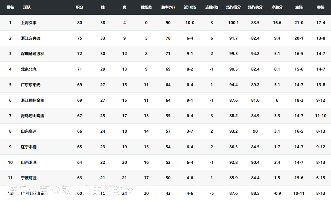 上海38胜4负、广厦33胜9负、深圳30胜12负、北京29胜13负、广东27胜15负、浙江27胜15负、青岛25胜17负、山东24胜18负、辽宁23胜19负、山西22胜20负、宁波21胜21负、广州18胜24负。
