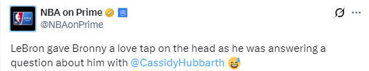 2026-04-25 10:20北京时间4月25日,NBA季后赛继续进行,火箭队对阵湖人队。本场比赛,布朗尼在上半场2投2中得到5分,还接到父亲詹姆斯的传球完成空接,上演父子连线。在上半场比赛结束后,布朗尼在场边接受了媒体采访。在布朗尼接受采访时,詹姆斯曾拍了一下他的头。