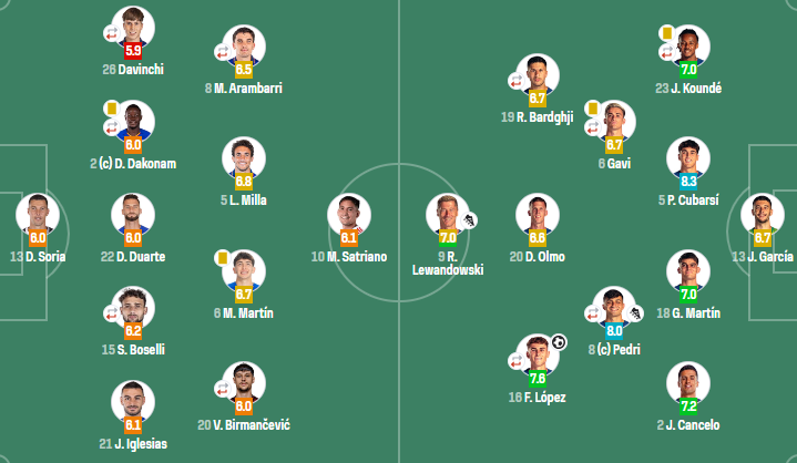 巴塞罗那(4-2-3-1):霍安-加西亚;孔德(60'阿劳霍),库巴西,赫拉德-马丁,坎塞洛;加维(60'德容),佩德里;巴德吉(60'拉什福德),奥尔莫,费尔明(82'巴尔德);莱万多夫斯基