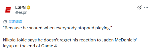 约基奇:因为在所有人都默契停手、放弃进攻的情况下,他依旧选择得分。大家都亲眼目睹了全过程,其中的缘由,所有人心里都清楚。
