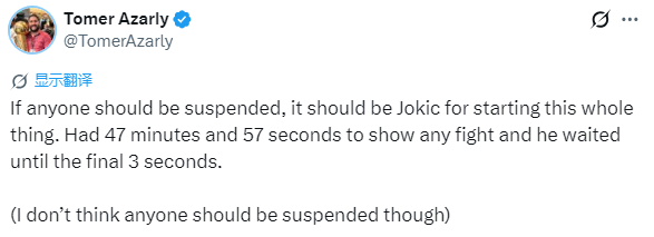 快船记者Tomer Azarly发推写道:如果有人应该被禁赛,那第一个就是约基奇,他有47分钟57秒去展现斗志,却等到最后3秒才付出行动。(不过我并不认为有人应该被禁赛)。