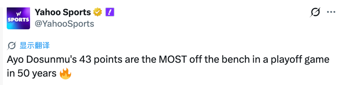 本场比赛,多森姆替补出战42分钟,投篮17中13,三分球5中5,狂砍全队最高的43分,外带4篮板1助攻1盖帽,他创造了近50年来NBA季后赛替补球员单场最高得分纪录,上一位在季后赛替补拿到40+得分的球员,还是16年的库里,当时库里在季后赛对阵开拓者的G4替补出战37分钟,拿到40分9篮板8助攻。
