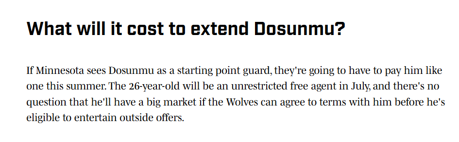 如果森林狼将多森姆视作首发控卫来培养,那今年夏天就必须匹配相应档次的薪资待遇。这位26岁球员将在7月成为完全自由球员;倘若森林狼没能在他有权接受其他球队报价前完成续约谈判,他必然会引来全联盟多队哄抢。