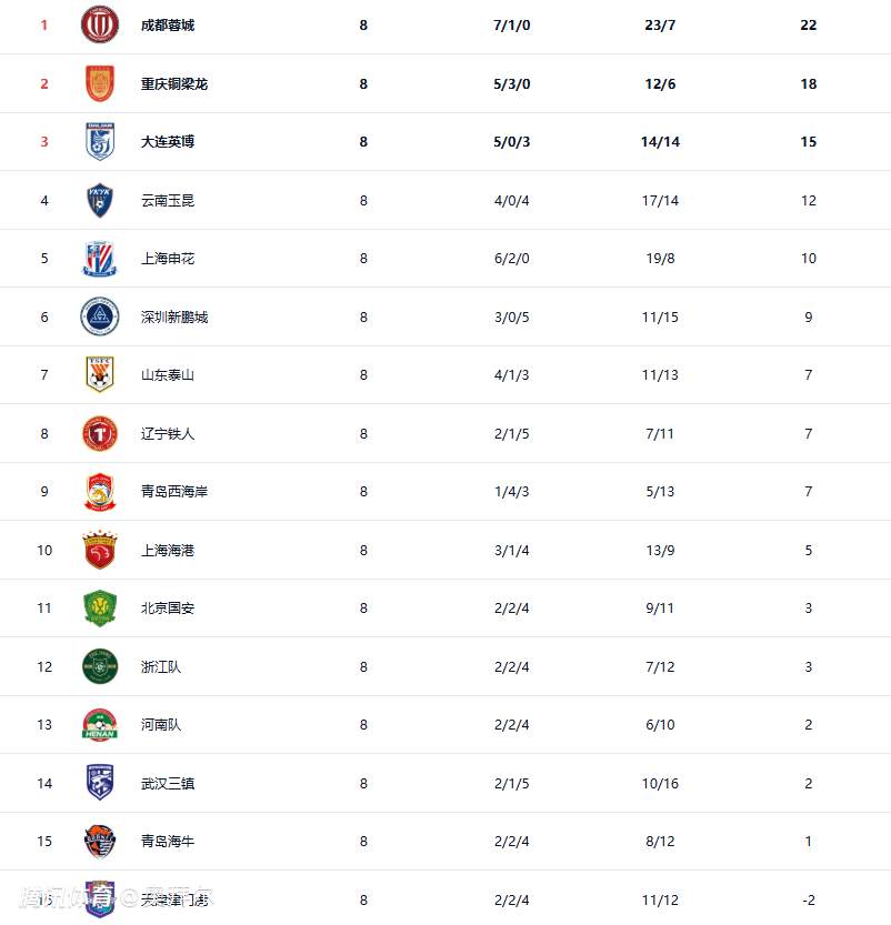 前8轮之后,成都蓉城、重庆铜梁龙、上海申花保持不败。成都蓉城以22分排名榜首,重庆铜梁龙以18分排名第二位,申花则以10分排名第5位。