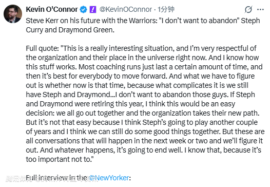 “我们现在需要弄清楚的是,当下是否就是该落幕的时刻。而让抉择变得棘手的关键,是库里和追梦仍在队中……我不愿抛下这两位球员。”