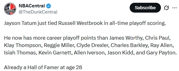 此役,凯尔特人队还有多位球员迎来个人里程碑。塔图姆此役砍下30分11助攻,季后赛生涯总得分达到3035分,他连续超越了沃西(3022分)和克莱-汤普森(3032分),追平威斯布鲁克,并列历史第28位。此外,这还是塔图姆季后赛第3次单场至少30分10助攻,超越伯德独占队史第2,仅次于哈弗里切克的4次。