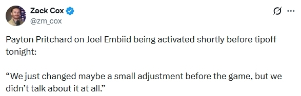 在谈到恩比德复出的话题时,普里查德说道:“赛前我们只做了小幅战术调整,但全队根本没有过多讨论这件事。”