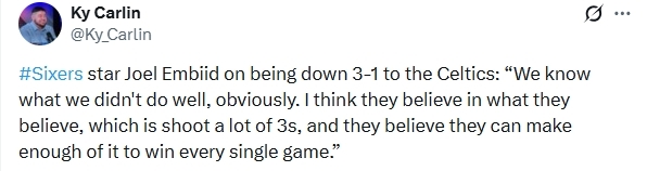 恩比德谈到1-3落后的局面时表示:“很明显,我们清楚自己哪些地方做得不好。凯尔特人坚持自己的打法,大量出手三分球,他们坚信自己能投进足够多的三分,从而赢下每一场比赛。”
