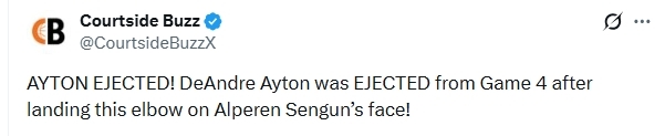 2026-04-27 12:40北京时间4月27日,NBA季后赛继续进行,火箭队对阵湖人队。本场比赛进行到第三节,艾顿肘击打到申京的面部,裁判观看录像后将艾顿的犯规升级为二级恶意犯规,直接将他驱逐。