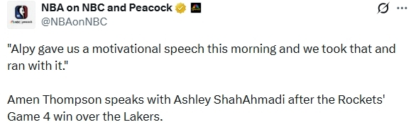 2026-04-27 13:30北京时间4月27日,NBA季后赛继续进行,火箭队115-96击败湖人队。阿门-汤普森此役16投10中得到23分4篮板7助攻,赛后,他在场边接受媒体采访。