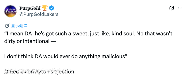 谈及艾顿肘击申京被驱逐一事,雷迪克表示:“我是说艾顿,他的性格特别温和善良,那球绝对不是脏动作,也不是故意的,我不觉得艾顿会做出任何恶意伤人的行为。”