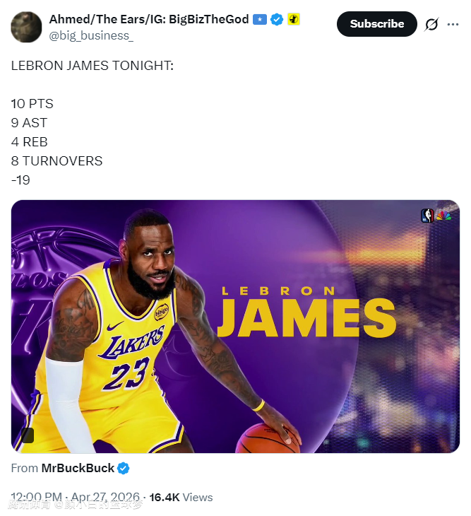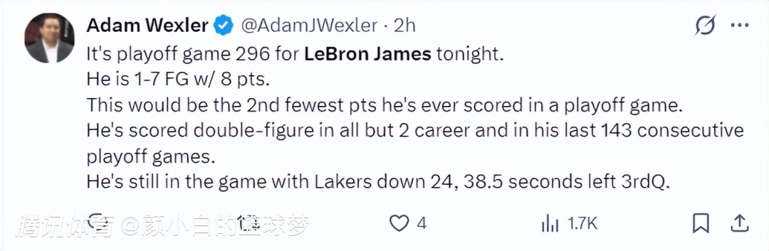 NBA记者亚当-韦克斯勒暗示了为什么雷迪克一直不换詹姆斯,因为这场比赛是詹姆斯第296场季后赛,他前三节只有8中1拿8分是季后赛第二低得分,他生涯只有两场不上双,而且已经连续143场季后赛上双。