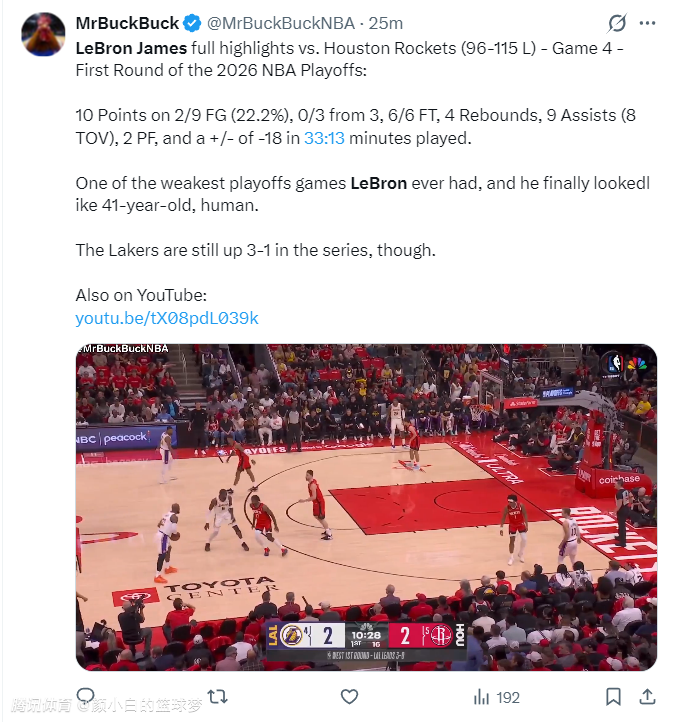 2026-04-27 14:20湖人与火箭的G4输得非常彻底,湖人一度落后28分,第三节湖人众将的肢体动作都已经有些消极,球迷们也在讨论这场可以早早放弃了但雷迪克就是不换下勒布朗-詹姆斯,八村垒都只打了29分钟,而勒布朗全场则打了33分13秒,老詹累的死去活来。