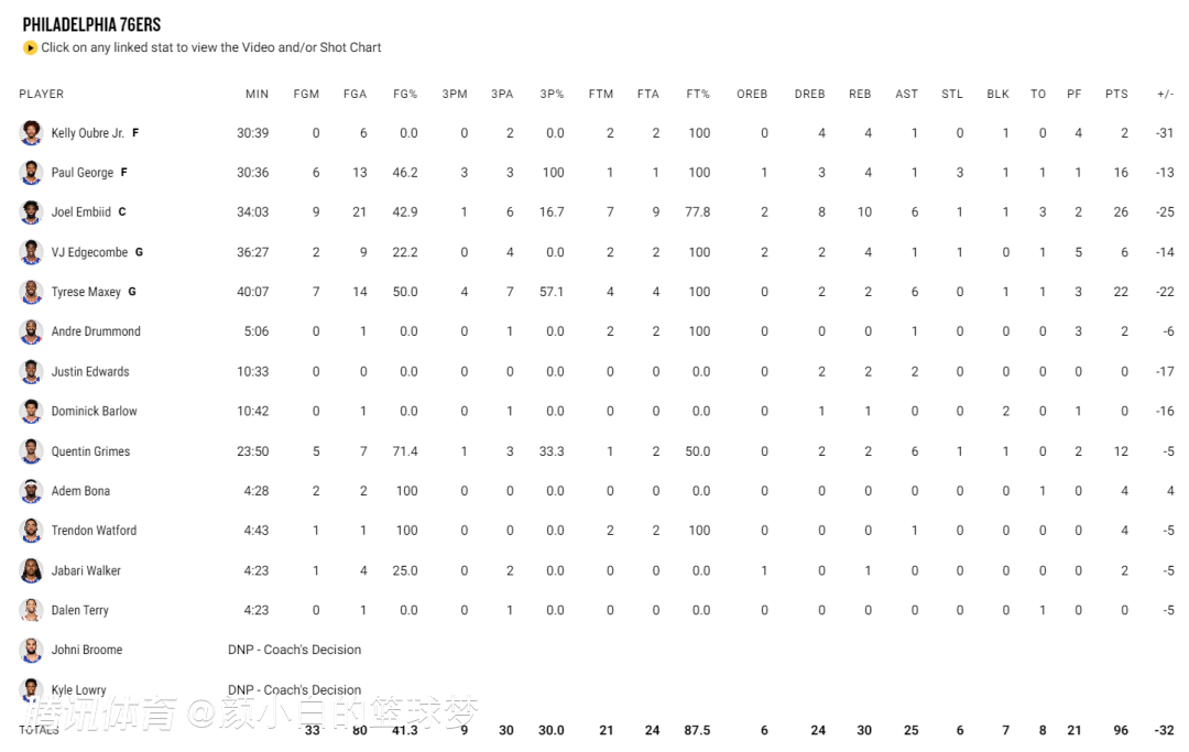 乌布雷前三场比赛得分都上双,场均13分,而这场比赛乌布雷6中0只拿2分,恩比德回来让全队都非常不适应。