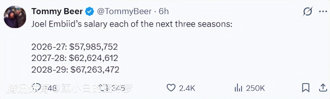 这场比赛后,NBA记者Tommy Beer写道,恩比德还剩三年合同,26-27赛季5798万、27-28赛季6262万、28-29赛季6726万,很明显他也觉得恩比德早已不是那个MVP,他是费城的累赘。