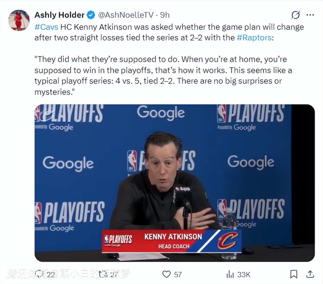 阿特金森赛后这样说道:猛龙完成了他们该做的事,当你身处主场时就该获胜,这是季后赛的规则。这轮系列赛看起来就是经典的季后赛对决,如今两队2-2要拼天王山没有什么意外的。