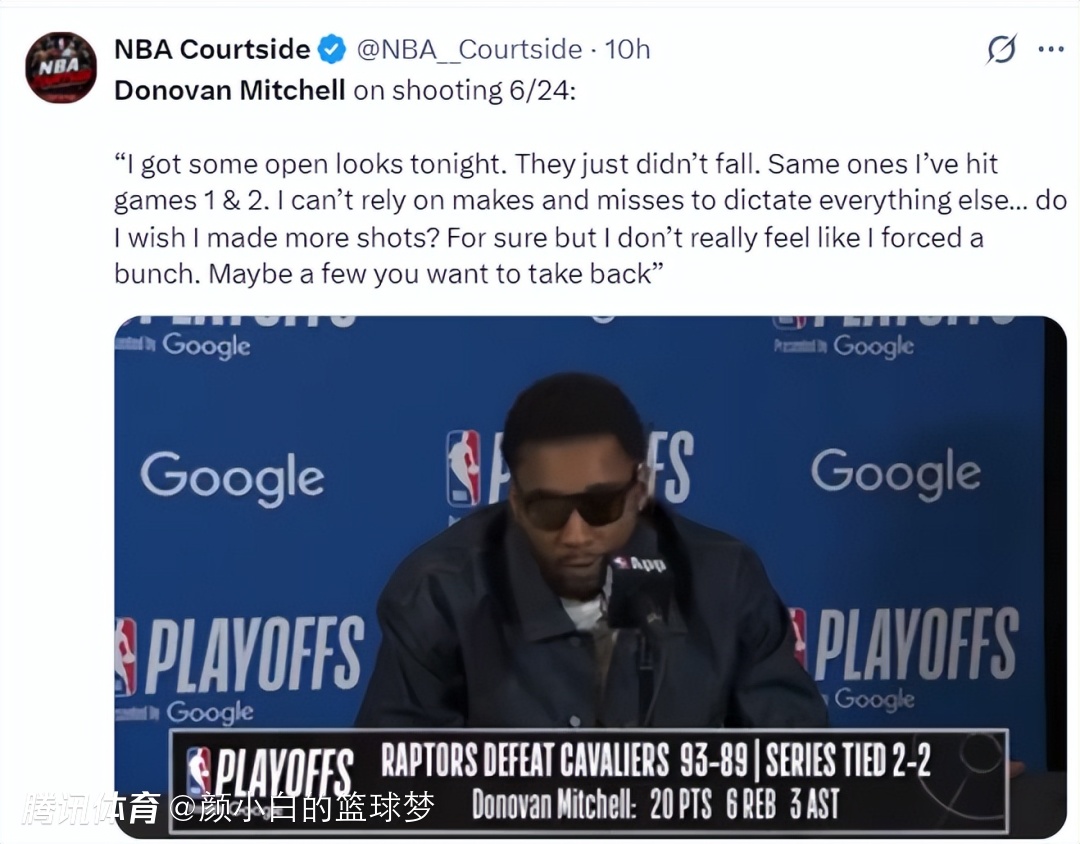 米切尔赛后并没有主动承担责任:我遭遇了一些不中球的情况,只是一些投篮没进而已,我和前两场遭遇的情况一样。我真的不觉得自己强行投进了很多球,也就少数几个球会觉得不该投而已。(米切尔自加盟骑士后,客场面对常规赛胜率超过50%的球队战绩1胜10负,这也算超级魔咒)