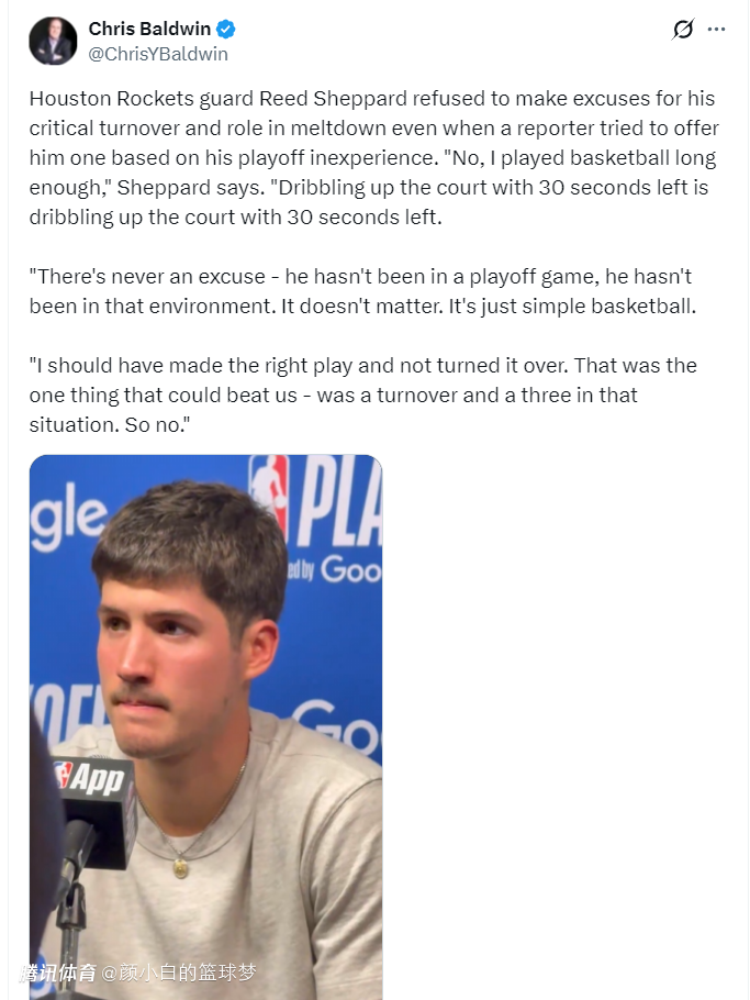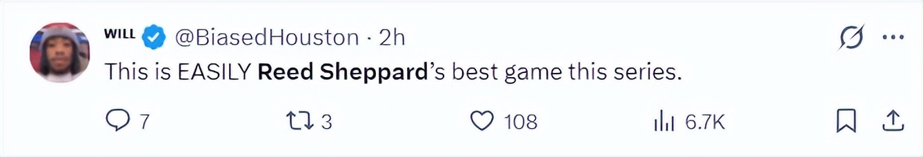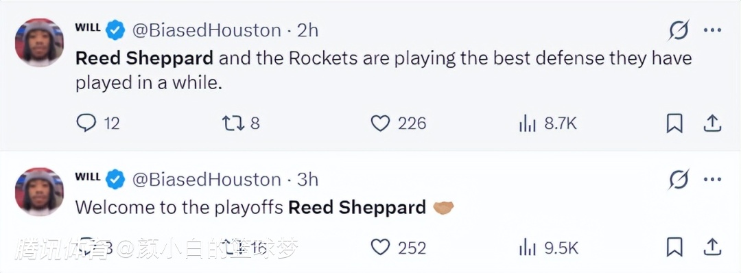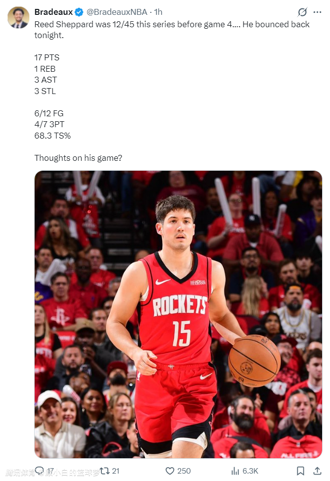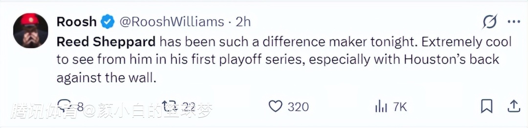 休媒Roosh:谢泼德这场比赛的表现堪称出色,看到他季后赛能首次发挥出色太棒了,尤其是在火箭队濒临绝境的情况下。