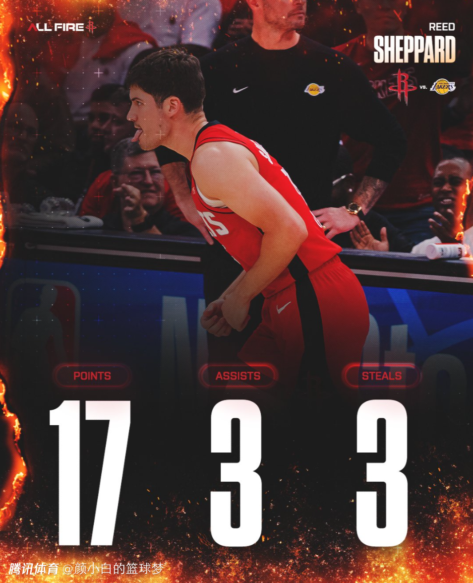 2026-04-27 16:50里德-谢泼德打出了首轮系列赛最佳一战,全场比赛拿到17分3助攻3抢断1篮板4个三分球,他在第三节连续命中两个三分球后吐舌庆祝,因为火箭队已经将分差拉开到20+,谢泼德终于扬眉吐气了。