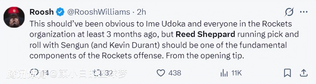 休媒Roosh:实际上在三个月之前,乌度卡与火箭队所有人就该明白,谢泼德、申京、杜兰特的配合才应该是火箭队进攻体系中不可或缺的核心组成部分,从一开始就应该这样。