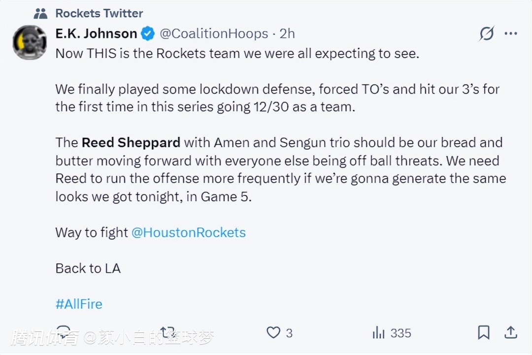 美记EK-杰克逊写道:这才是我们一直期待看到的火箭队,他们终于执行了严格的防守策略成功迫使对方出现失误,这是他们系列赛第一次做到这一点。谢泼德、阿门、申京这三位年轻球员进攻端成为最大的威胁,希望他们第五场的投篮跟这场比赛一样,让谢泼德更多组织进攻。