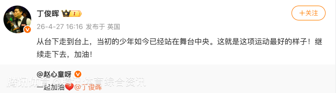 赛后,赵心童在社交平台发文向前辈致敬,他在社媒写道:“一起加油。”丁俊晖稍早前也在社媒转发了赵心童这则动态,并且写道:“从台下走到台上,当初的少年如今已经站在舞台中央。这就是这项运动最好的样子!继续走下去,加油!”