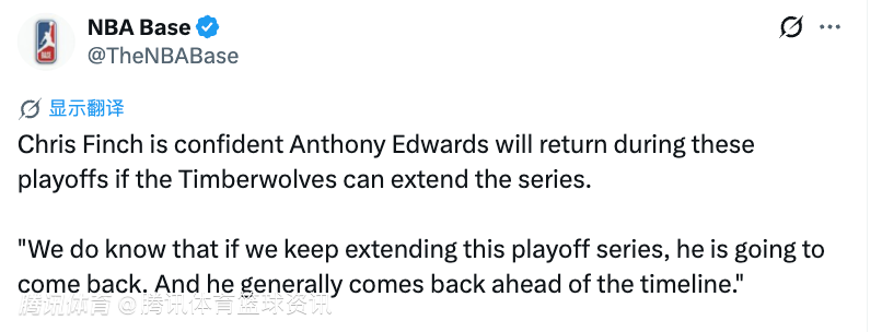 近期,森林狼主帅克里斯-芬奇表示,只要球队能把系列赛拖下去,他有信心爱德华兹会在本次季后赛中复出:“我们很清楚,如果我们能一直把系列赛打下去,他就会回来。而且他通常都会比原定的复出时间表更早回归。”