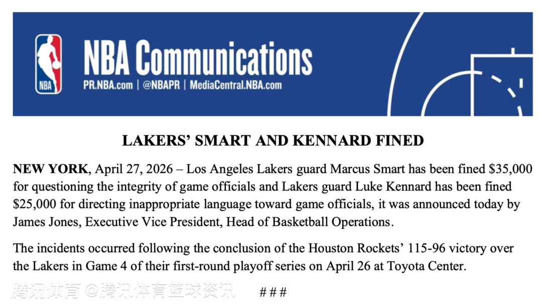 2026-04-28 10:00北京时间4月28日,NBA官方宣布,斯马特因质疑裁判公正性,被处以35000美元罚款,肯纳德因对裁判使用不当语言,被处以25000美元罚款。