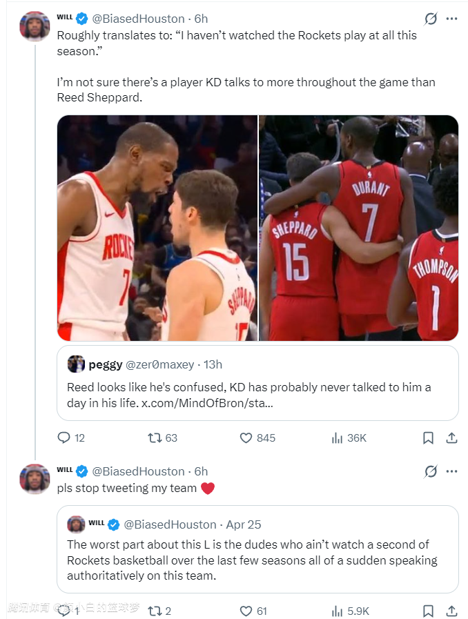 另一休媒Will也转推,他还晒出了杜兰特与谢泼德赛场非常亲密的瞬间写道:你的意思是我这个赛季没有看过火箭队比赛。我不确定在整个赛季,杜兰特与谢泼德的交流比谁更多。