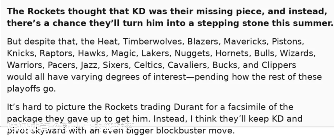 随后The Ringer记者迈克尔-皮纳发长文分析杜兰特可能的下家,火箭原本是把杜兰特当成总冠军拼图,可这个赛季后火箭已经将KD视为冲击总冠军的跳板,如果杜兰特可以被交易那么联盟可能有多达21支球队有意,火箭也可能留下杜兰特以推动更大的交易,例如换来扬尼斯、伦纳德等超巨组建银河战舰。