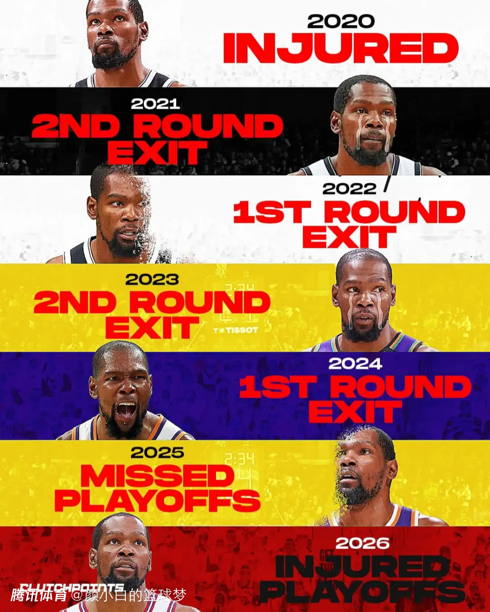 美媒晒出杜兰特2019年离开勇士后的战绩,两次打到次轮,两次首轮被横扫,两次没打季后赛,目前首轮大比分1-3落后。