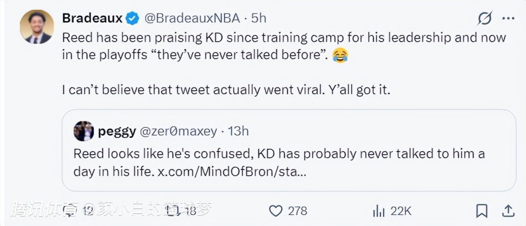 有美媒还造谣杜兰特与谢泼德之间的矛盾开始尖锐,在季后赛根本没有交流过。休媒Bradeaux转推后写道:谢泼德从训练营开始就盛赞杜兰特的领袖能力,在季后赛期间他们从未交流过?(苦笑)我不懂这些的消息是如何获得高赞的。