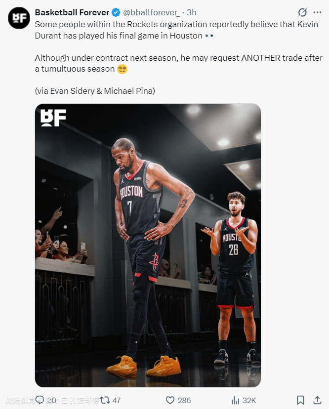KD打完火箭最后一场?名嘴称更衣室隔阂已显露 休媒转推反驳造谣言论