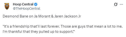 此役,贝恩的两位前队友莫兰特和小贾伦-杰克逊来到现场支持他,谈到此事时,贝恩表示:“这份情谊格外珍贵。我和他们并肩作战了五年,和他们一同打球的时光无比美好。无论未来身在何方,这份友谊都会地久天长,很感谢他们特地前来为我助阵。”