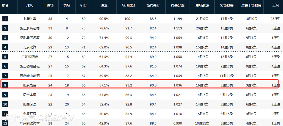 但山东的内线确实在冲抢方面占据优势,场均14.4个前场篮板球高居第一,全队场均可以拼下39.8个篮板球。
