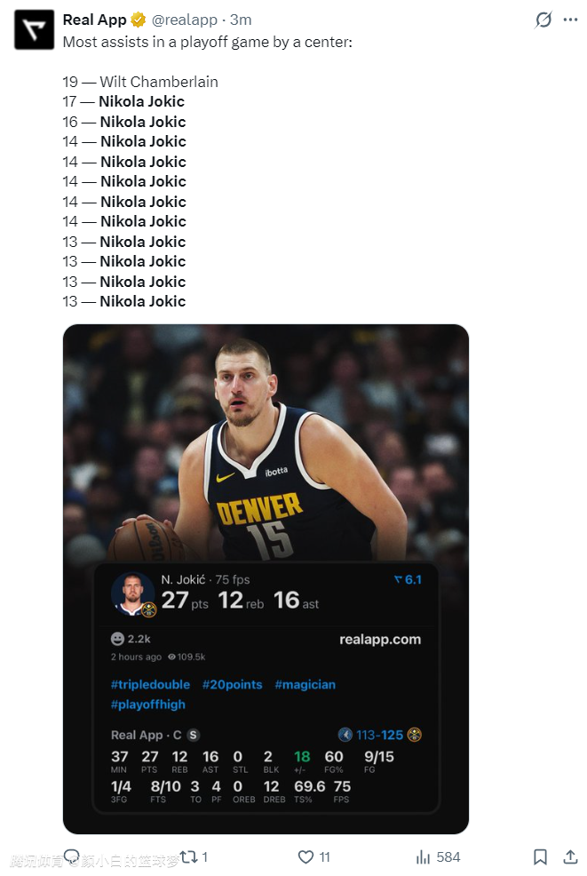 第三节约基奇仅仅出战3分钟就完成了三双,22分钟已经拿到14分10篮板11助攻,这是约基奇季后赛生涯第23次三双,约基奇常规赛198次三双+季后赛23次三双追平威少总数221次并列历史第一。