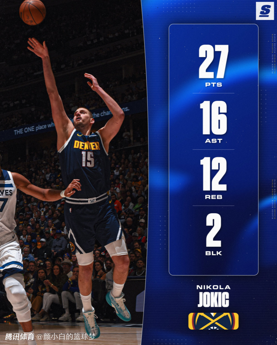 全场比赛,约基奇37分钟, 15中9,三分4中1,拿到27分16助攻12篮板2盖帽,命中率60%,真实命中率63.9%,正负值+25。