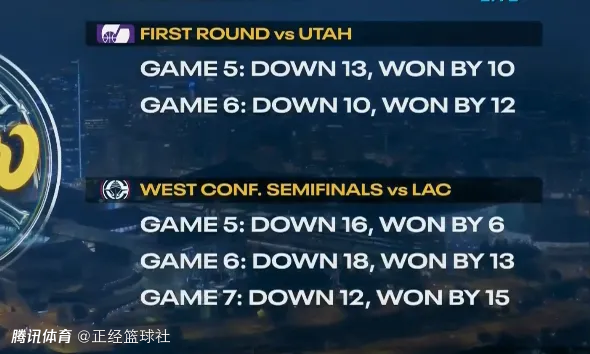需要说明的是,在六年前的2020年季后赛中,掘金队创下联盟罕见壮举,连续两轮身陷1-3落后绝境,却接连完成史诗级逆风翻盘。首轮直面爵士,G5、G6多次开局大幅落后,球队稳扎稳打实现强势翻盘;次轮迎战快船,多次半场深陷十几分分差泥潭,但是他们连扳三场再次完成逆转。