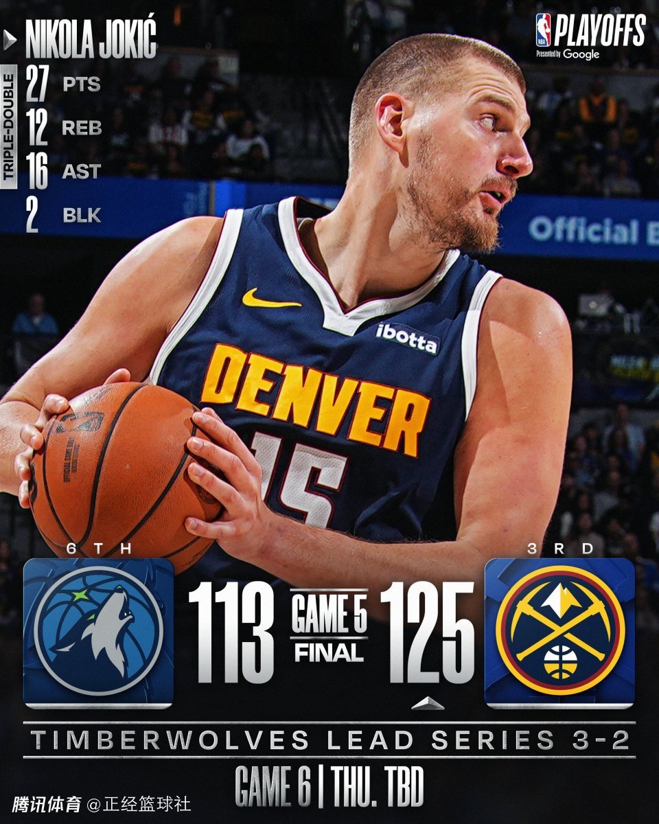 2026-04-28 15:00北京时间4月28日,NBA季后赛继续进行。在今天一场西部首轮对决中,掘金队主场125-113击败森林狼队,将系列赛总比分扳成了2-3!